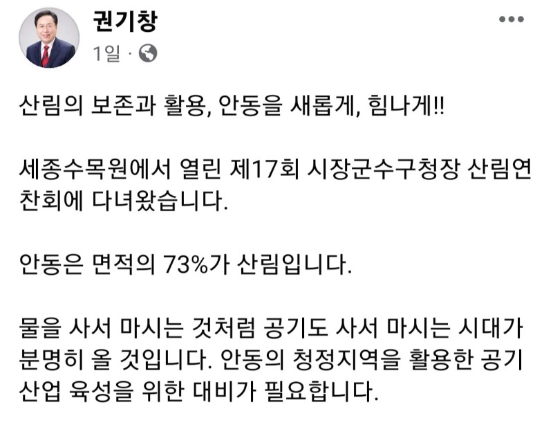 권기창안동시장의 활동 SNS에서 확인 할 수 있듯이 “물을 사서 마시는 것처럼 공기도 사서 마시는 시대가 분명히 올 것이다”며 “안동의 청정지역을 활용한 공기산업 육성을 위한 대비의 필요성”을 언급 하고 있다.