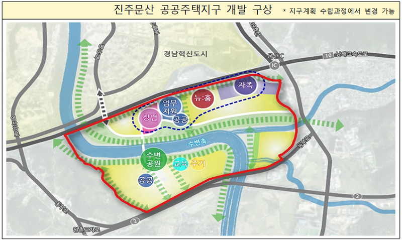 또 첨단산업 관련 창업 지원시설, 뉴:홈 공급 등으로 지역의 자족 기능을 높이고 진주 혁신도시와 문산 IC등과 연계한 생활 SOC, 커뮤니티 공간 등을 배치할 예정이다.