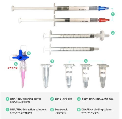 특수 제작된 주사기는 3방향 밸브(3-way cock)1)에 DNA/RNA가 붙을 수 있는 컬럼(Column)2)을 설치해 추출용액과 불순물, 그리고 순수한 DNA/RNA를 따로 분리할 수 있다.
