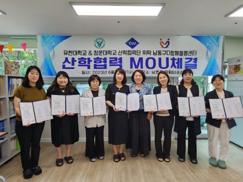 업무 협약식에는 남동구 6개 다함께돌봄센터 센터장과 유한대학교 아동보육학과 황소영 교수, 청운대학교 산학협력단 김현 교수가 참석했다.