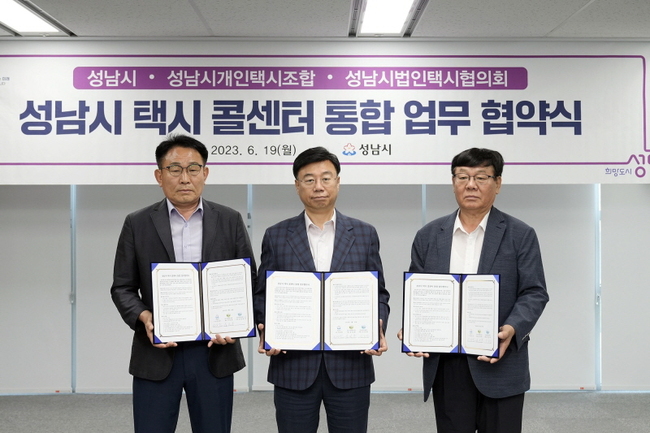 성남시는 6 월 19 일 시청 상황실에서 ‘ 푸른콜 ’ 개인택시조합과 ‘ 브랜드콜 ’ 법인택시협의회로 이원화돼 있는 택시 콜센터를 ‘ 성남콜 ( 가칭 )’ 로 통합하는 업무협약을 체결했다 .