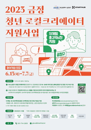 참여 희망 청년(기업)은 신청서 등 구비서류를 갖추어 오는 7월 7일까지 이메일로 신청하면 된다. 신청 서식 및 자세한 사항은 금정구청 홈페이지에서 확인하거나 스타트허브㈜ 금정 청년 로컬크리에이터 운영팀으로 문의하면 된다.