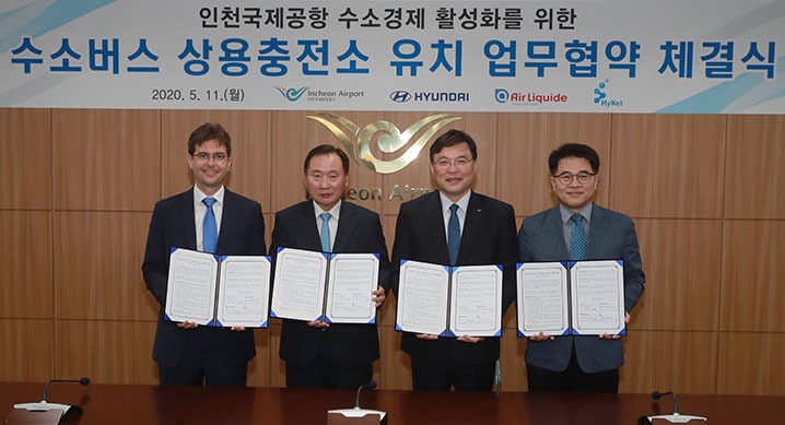 현대자동차는 지난 11일(월) 인천광역시 중구에 위치한 인천국제공항공사에서 구본환 인천국제공항공사 사장, 기욤 코테(Guillaume Cottet) 에어리퀴드코리아 대표이사 사장, 유종수 수소에너지네트워크 대표, 한성권 현대자동차 상용사업담당 사장 등 사업 관계자가 모인 가운데 인천국제공항 수소전기버스 충전소 유치를 위한 업무협약을 체결했다.