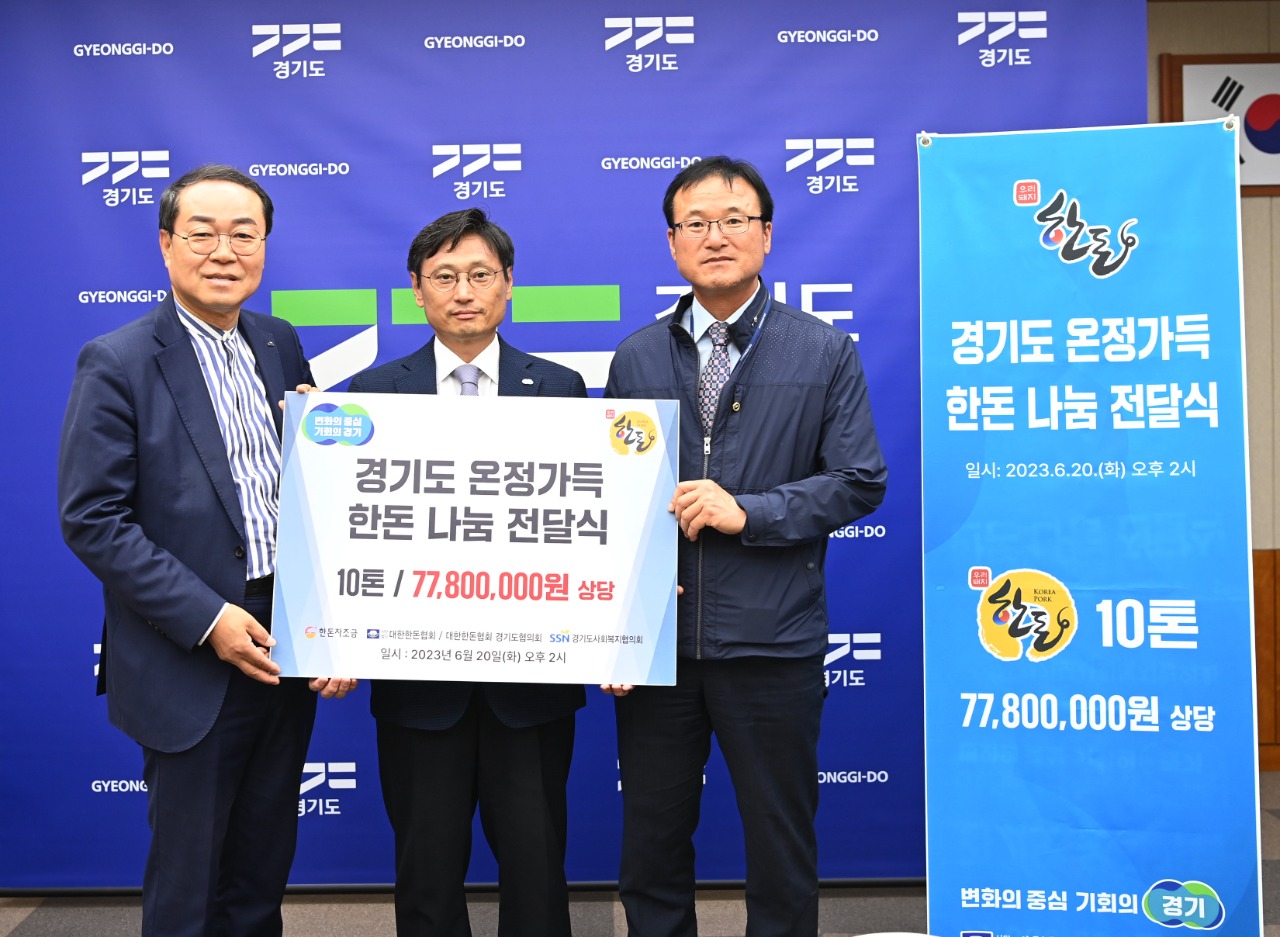 경기도는 오후석 행정2부지사, 최영길 대한한돈협회 경기도협의회장, 강기태 경기도사회복지협의회 회장 등이 참석한 가운데 20일 경기도청 북부청사에서 ‘온정 가득 한돈 나눔 전달식’을 가졌다.