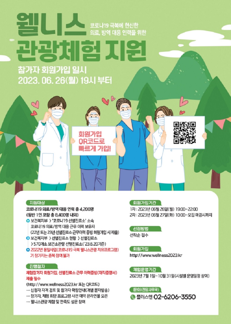 문화체육관광부는 보건복지부, 한국관광공사와 함께 코로나 최전선에서 헌신한 보건의료인 4000명을 위해 ‘웰니스관광 체험 지원사업’ 신청을 받는다고 20일 밝혔다.