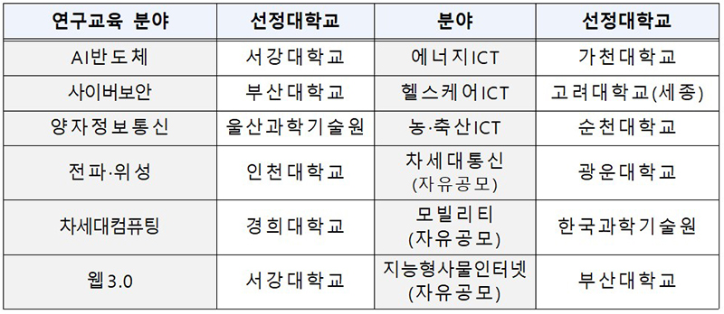 특히 올해는 국가 전략기술 및 산업 수요가 높은 분야인 ▲인공지능반도체 ▲사이버보안 ▲양자정보통신 ▲전파·위성 ▲차세대컴퓨팅 ▲웹3.0 ▲에너지-ICT ▲헬스케어-ICT ▲농축산-ICT ▲자유공모(3개) 과제에서 서강대, 경희대, 순천대 등 12개 대학을 선정했다.