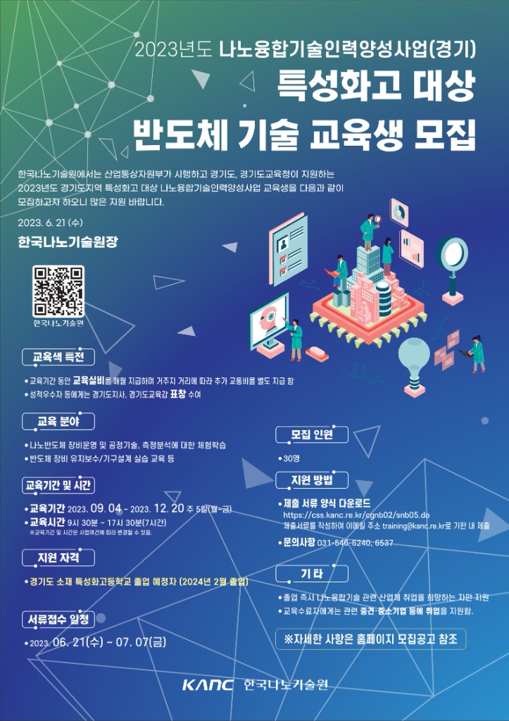 경기도와 한국나노기술원이 도내 특성화고 3학년을 대상으로 2023년도 반도체 기술 교육생 30여 명을 다음 달 7일까지 모집한다.
