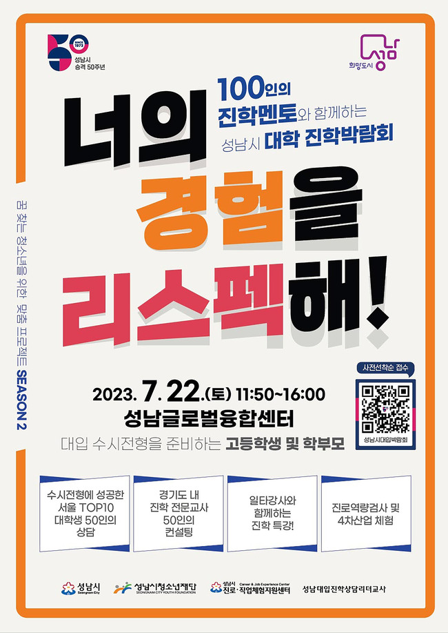 성남시는 오는 7월 22일 오전 11시 50분~오후 4시 성남글로벌융합센터(수정구 시흥동)에서 대학 진학박람회를 개최한다.