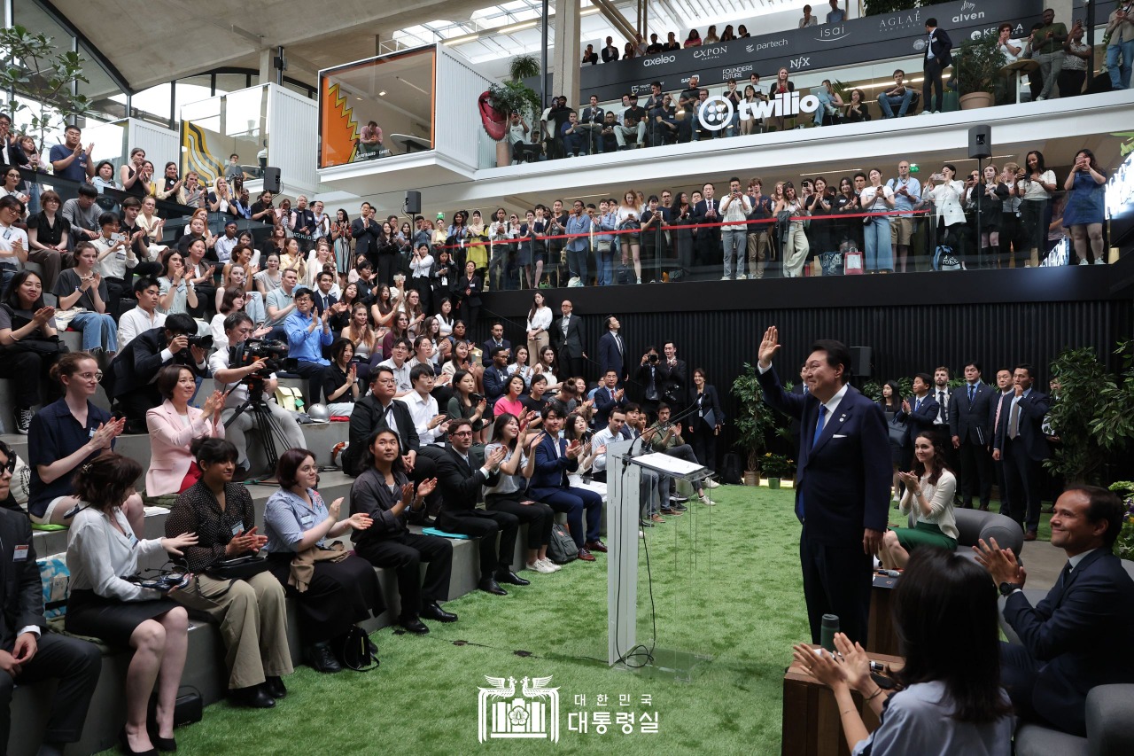 대통령은 “세계에서 가장 큰 스타트업 캠퍼스인 스테이션 F에서 다양한 국적과 배경의 청년들이 연대의 정신으로 인류의 문제 해결에 도전하는 모습을 보았다”며, “세계시민의 자유와 국제사회의 평화·번영을 위협하는 공급망 교란, 에너지와 기후 위기, 보건과 디지털 격차 등 도전과 위기를 극복하기 위해서는 오직 자유와 연대에 기반한 끊임없는 혁신이 요구되고, 미래세대가 자유주의와 국제주의에 기반한 혁신 마인드로 무장해야 한다”고 강조했다.