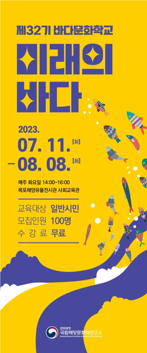 문화재청 국립해양문화재연구소는 7월 11일부터 8월 8일까지 매주 화요일 오후 2시 목포해양유물전시관 사회교육관에서 <제32기 바다문화학교>를 운영하기로 하고, 6월 22일부터 수강생을 모집한다.