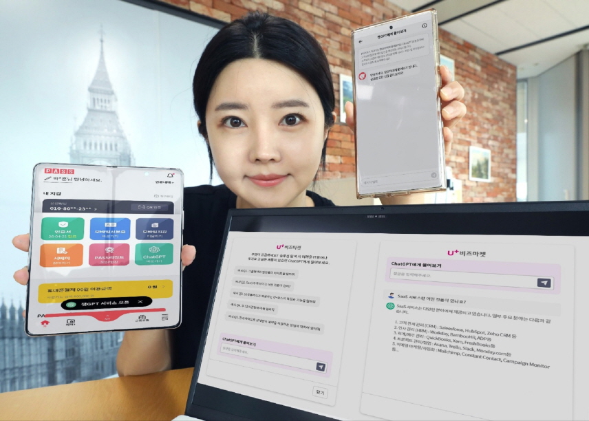 LG유플러스는 U+비즈마켓 외에도 'PASS by U+', '우리가게패키지' 전용 앱에 챗GPT 기능을 적극 도입하고 있다. PASS 앱에 챗GPT 도입은 통신사 최초의 사례로, 이용자의 편의성을 강화하고 고객의 불편사항을 청취하는 데 목적이 있다. 보다 앞선 3월에는 소상공인 특화 상품 패키지인 '우리가게패키지'의 전용 앱에서 'ChatGPT에게 물어보기' 기능을 선보인 바 있다.