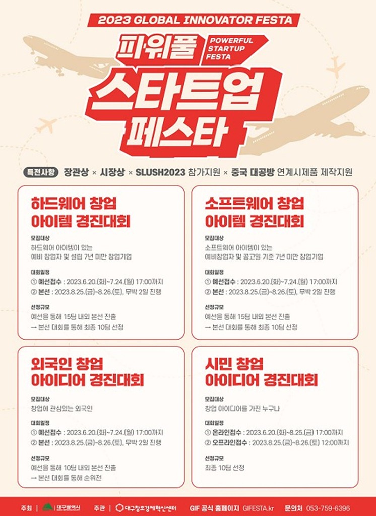 올해로 8회째를 맞이하는 글로벌 이노베이터 페스타(GIF)는 시민들이 쉽게 스타트업을 이해하고 다가갈 수 있도록 올해부터 ‘2023 파워풀 스타트업 페스타(제8회 GIF)’로 부제를 선정하고 8월 25일(금) ~ 26일(토) 대구삼성창조캠퍼스에서 개최한다.