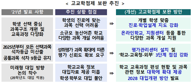 고교학점제는 2025년부터 전면 실시하되, 그동안 학교 현장에서 지속적으로 제기돼 왔던 문제점들을 보완해 추진해 나간다.