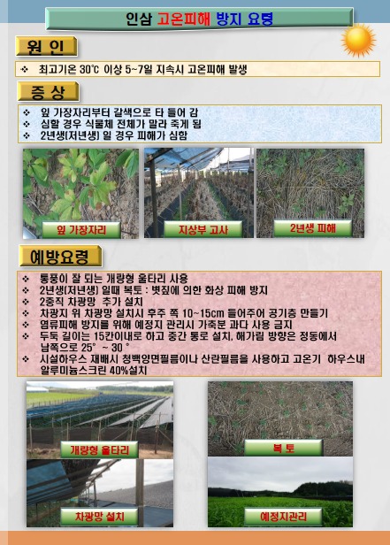 폭염에 의한 인삼 고온 피해 예방을 위해 ▲통풍이 잘되는 개량형 울타리 사용 ▲저년 생일 때 흙 2cm 정도 덮기(복토 : 볏짚에 의한 화상 피해 방지) ▲2중 직 차광망 추가설치 ▲염류 피해 방지를 위한 가축분 과다 사용 금지 ▲일정 간격마다 바람 통로 설치(15칸 정도) ▲주기적 수분공급 ▲시설하우스 재배 시 하우스 내 알루미늄스크린 40% 설치 등을 실시해야 한다.