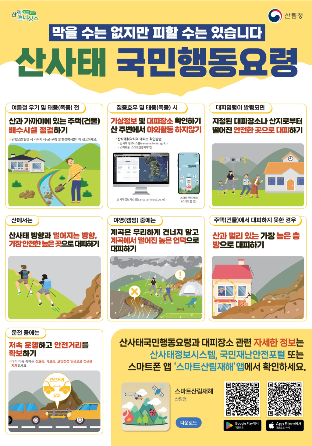 산사태 국민행동요령과 관련한 자세한 내용은 산사태정보시스템, ‘스마트산림재해’ 앱 또는 국민재난안전포털을 통해 국민 누구나 확인할 수 있다.
