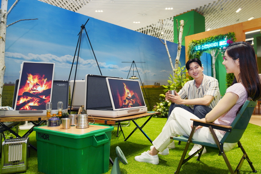 제품에 탑재된 모닥불, 아침 햇살, 비 오는 날, 눈 내리는 산장 등 총 8가지의 테마 영상은 불멍, 풀멍 등 캠핑 감성을 제대로 느끼게 한다. 야외 캠핑존은 LG 스탠바이미 Go와 함께 캠핑족에게 인기가 높은 브랜드인 ‘미니멀웍스’의 캠핑용 의자와 테이블, 폴딩박스 등을 활용한 감성 캠핑 공간으로 꾸며 시선을 사로잡는다.