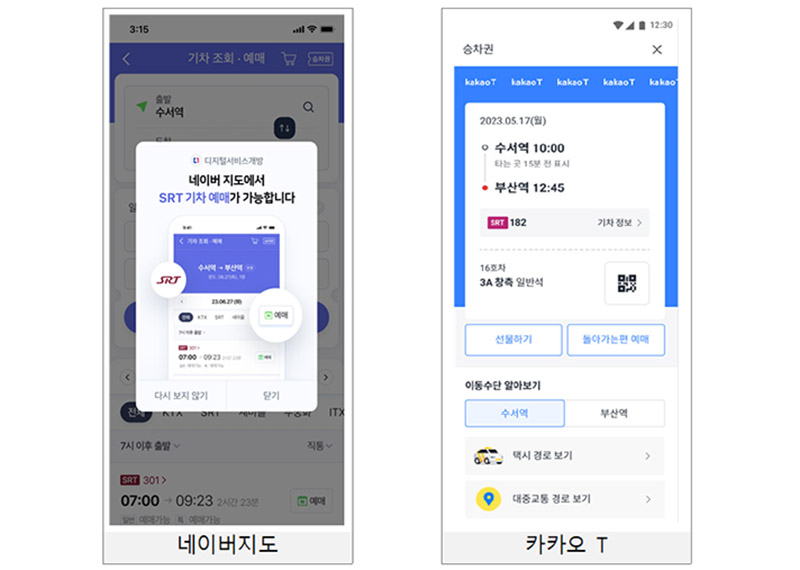 우선, SRT 승차권 예매는 네이버·네이버지도와 카카오T(하반기 토스, 신한pLay, KB스타뱅킹)에서 가능해진다. 지도 앱이나 모빌리티 앱에서 목적지에 가기 위한 경로를 조회하고 SRT 승차권을 예매할 수 있다.
