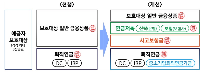 이번 개정안은 기존의 DC형 및 IRP 퇴직연금과 마찬가지로 연금저축(신탁·보험), 사고보험금, 중소기업퇴직연금기금 각각에 대해서도 일반 예금과 분리해 별도로 5000만 원의 예금보호한도를 적용한다.