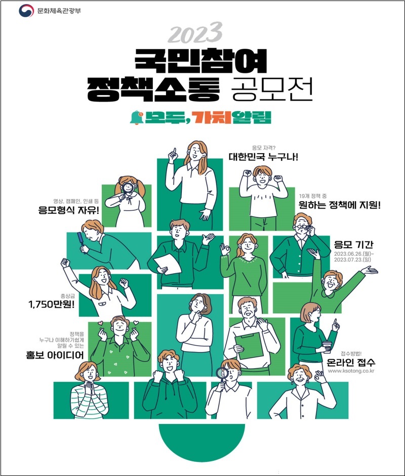 문화체육관광부는 국민에게 필요한 정책을 국민이 직접 알리는 2023 국민참여 정책소통 공모전 ‘모두, 가치알림’을 진행한다고 26일 밝혔다.
