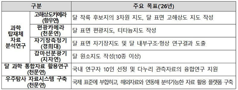 아울러 향후 달, 화성, 소행성 등 우주탐사 때 생성되는 자료를 효율적으로 관리하고, 분석까지 수행할 수 있는 우주탐사 자료시스템도 2026년까지 구축한다.