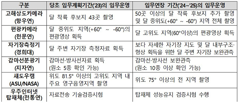 이에 1년 동안은 제한된 범위의 자료획득만 가능했으나, 임무기간 연장시 달 표면 촬영영상을 추가 확보하고 자기장측정기·감마선분광기의 보완관측을 진행하는 등 성과확대가 기대된다.