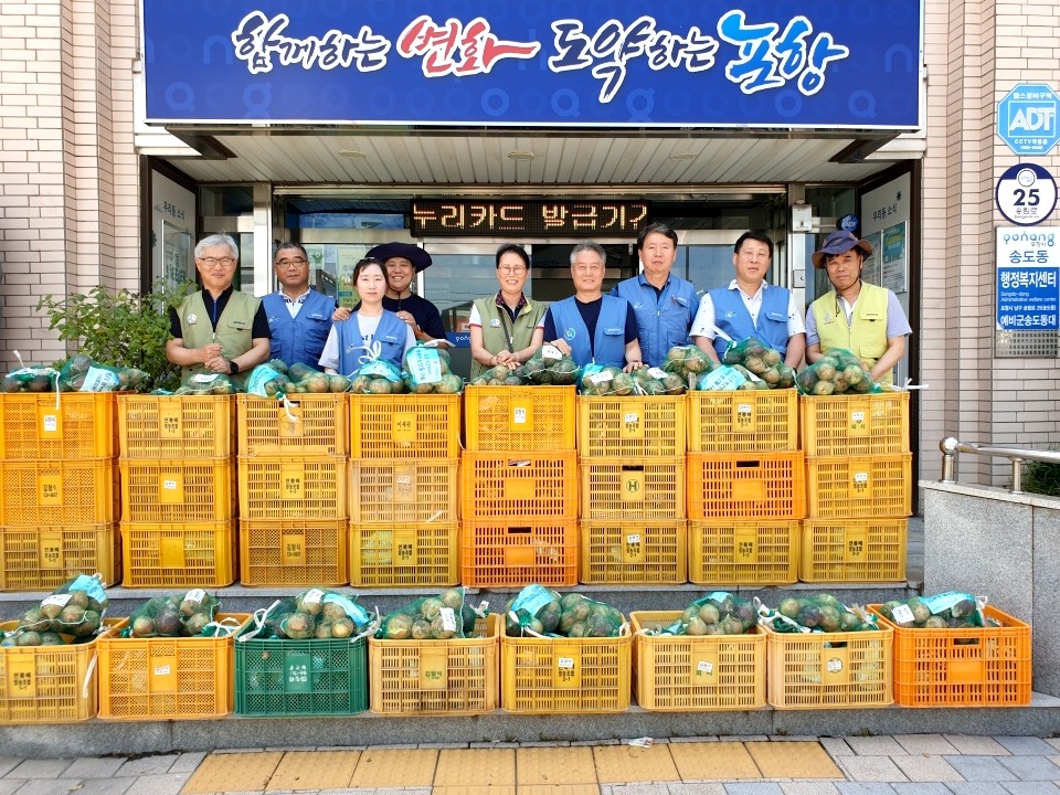 포항제철소 에코팜봉사단, 최웅렬 제강부장, 최윤 포항생산부장 등 포스코 관계자와 권오성 포항시자원봉사센터장, 최석하 송도동 개발자문위원장, 황선희 송도동 맞춤형복지팀장은 27일 송도동 행정복지센터에서 양파 기증식을 가졌다. 에코팜봉사단이 직접 키워 기증한 양파 620kg는 1인당 5kg씩 총 124명의 주민들에게 전달될 예정이다.