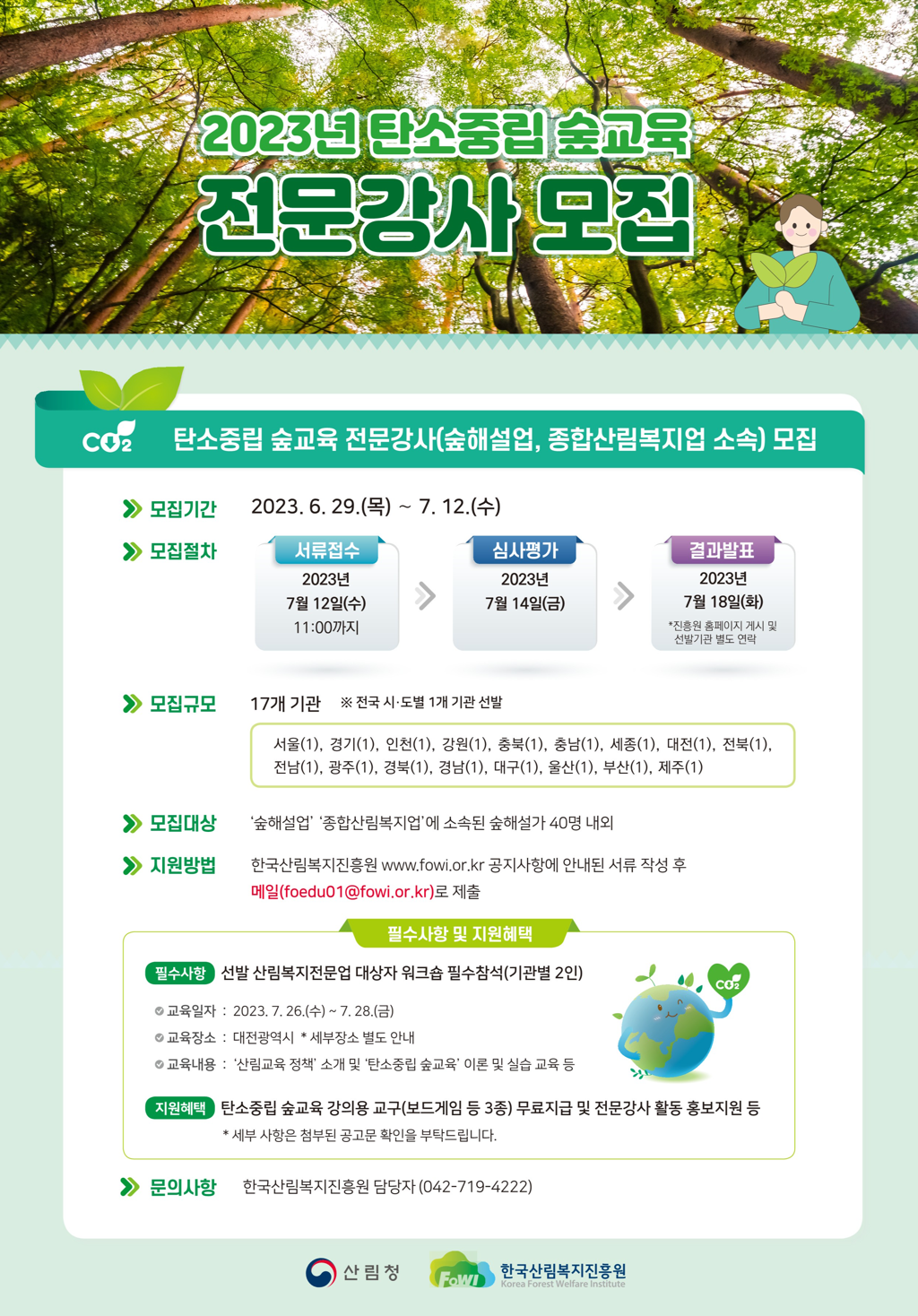 신청방법, 심사기준 등 자세한 사항은 한국산림복지진흥원 누리집 공고문을 참고하고, 기타 사항은 산림교육기획팀(042-719-4220~2)으로 문의하면 된다.