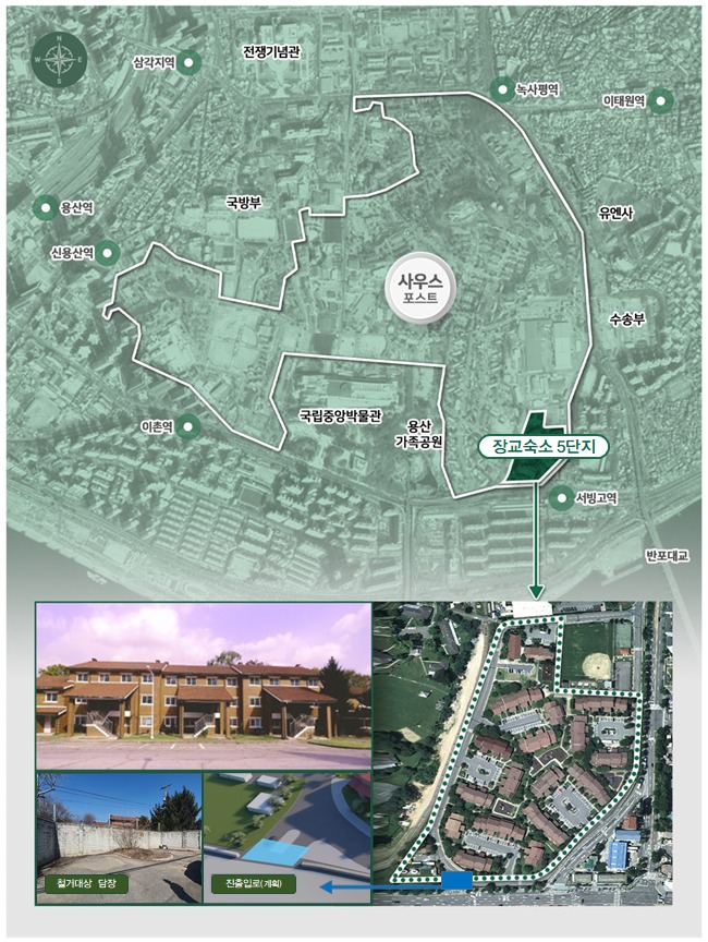 국토교통부는 지난해 12월에 개최된 용산공원조성추진위원회(공동위원장 국무총리 및 유홍준) 심의사항의 후속조치로, 미군 장교숙소 5단지*를 국민에게 개방하기 위한 리모델링에 착수하고자 우선 담장 일부(15m)를 철거하고 진출입로를 설치한다.