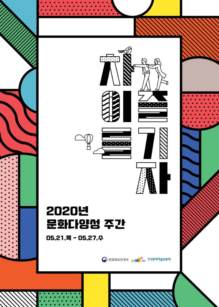 문화체육관광부(이하 문체부)는 한국문화예술위원회(위원장 박종관, 이하 예술위), 지역문화재단 26곳과 함께 5월 21일(목)부터 27일(수)까지 일주일간 ‘2020 문화다양성 주간’을 개최한다.