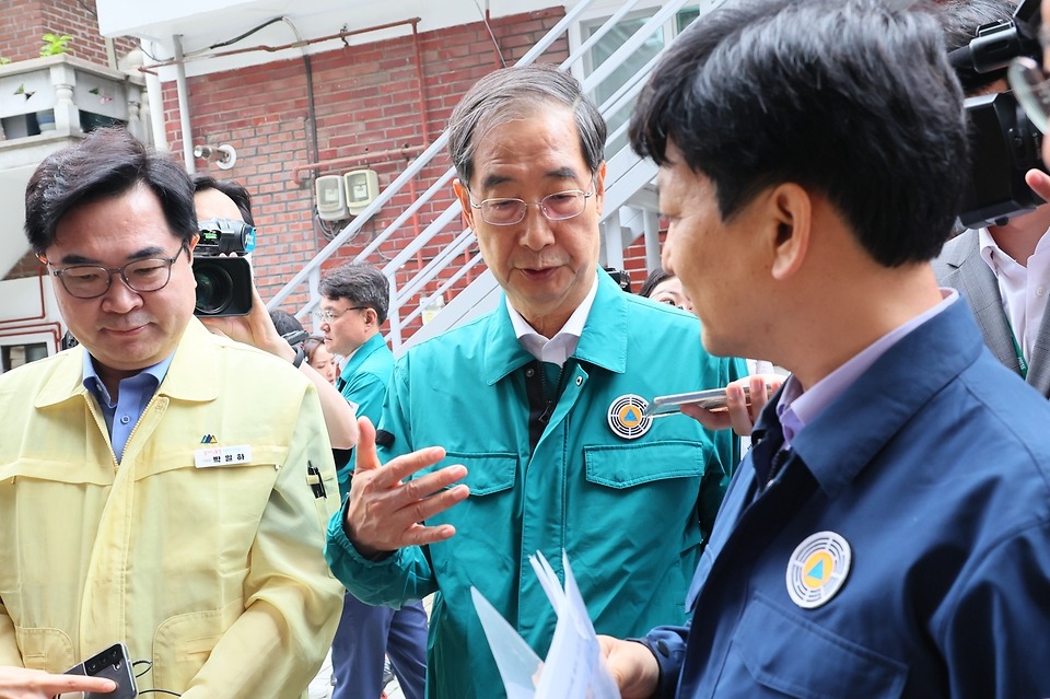 한덕수 국무총리가 집중호우 대처 상황 점검회의에서 침수 우려 지역 주민들에게 대피 및 행동 요령을 신속하게 안내하라고 주문했다.