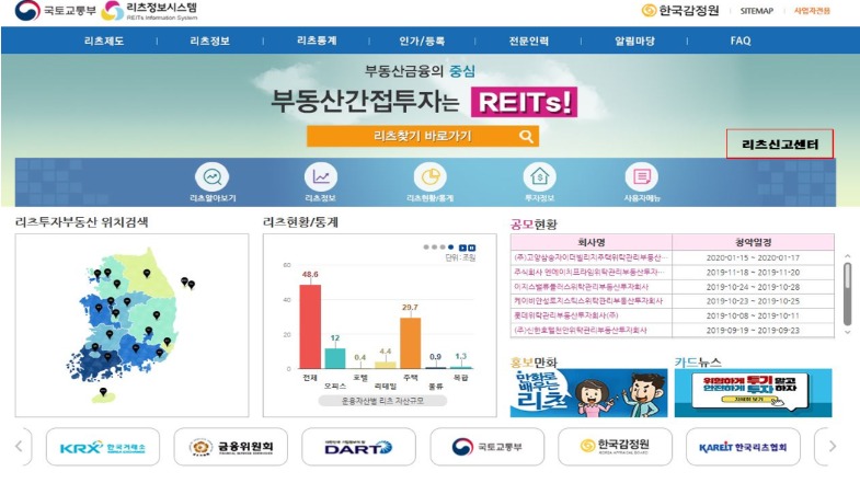 국토교통부 관계자는 “리츠 신고·상담센터가 건전한 리츠 투자환경을 조성하여 국민재산권을 보호하고 리츠시장 활성화에 기여할 수 있기를 바란다” 면서, “리츠 신고·상담센터 구축으로 기존에 운영 중이던 리츠정보시스템의 활용도 역시 크게 높아질 전망”이라고 밝혔다.