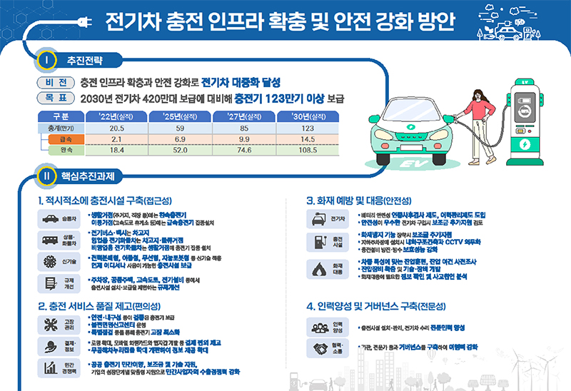 이번 방안은 환경부, 산업통상자원부, 국토교통부, 소방청 등 관계부처 합동으로 마련됐으며 전기차 충전 기반시설 확대와 화재 예방·대응이 주요 내용이다.