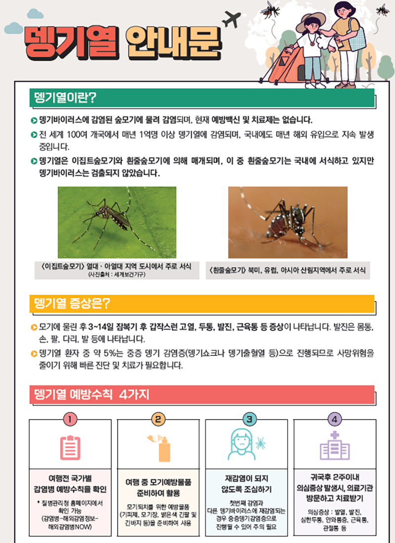 올해는 뎅기열 능동감시가 공·항만 검역(지)소 13곳으로 확대 시행된다. 다음 달부터 11월까지 해당 공·항만으로 입국하는 내국인 중 발열, 모기 물림 등의 뎅기열 감염 의심 시 신속진단검사를 무료로 실시한다.