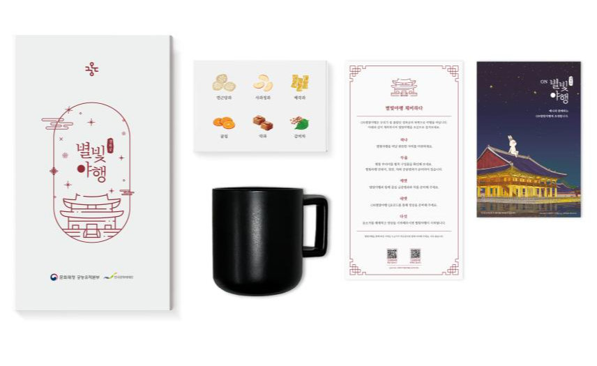이번에 진행되는 ‘궁온’ 프로그램에서는 ‘온(ON) 별빛야행’을 주제로 밤의 경복궁 정취를 영상으로 보며 다과를 즐길 수 있는 체험 꾸러미(키트)가 제공된다. 궁중병과 5종(연근당과⸱사과정과⸱매작과⸱약과⸱귤칩)과 약차 1종(감비차), 향기 나는 별빛카드와 손잡이가 달린 잔(머그잔)으로 구성했다. 토끼 캐릭터 ‘베니’로 유명한 구경선 작가와 협업하여 제작한 카드에는 베니가 경복궁, 창덕궁, 조선왕릉을 방문한 삽화가 그려져 있고, 향기도 첨가돼 있어 궁궐의 아름다움을 오감으로 즐길 수 있는 기회가 될 것이다.