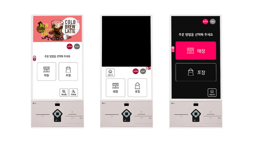 셀프 주문 및 결제솔루션을 탑재한 LG 키오스크는 통상 22형 또는 24형 키오스크들과 달리 27형(대각선 길이 약 68센티미터) 터치스크린을 적용해 시인성이 높다.