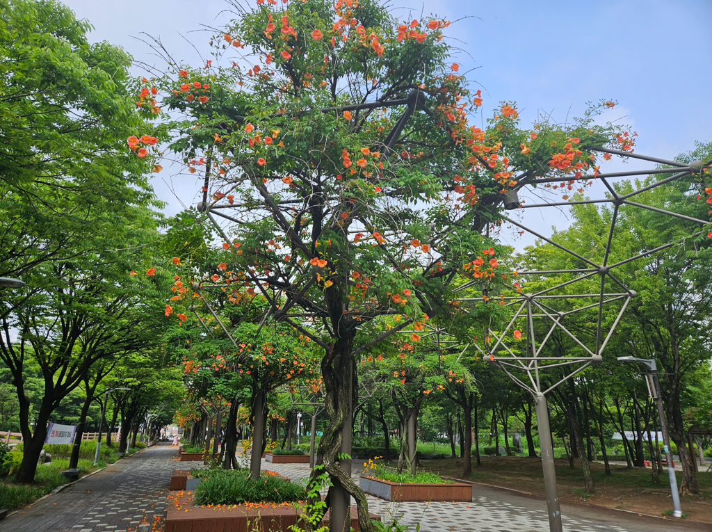 부천 소향로길(중앙공원)에는 초여름 꽃을 피우기 시작해 여름 끝자락까지 꽃망울을 터트리는 능소화길이 있다. 능소화는 덩굴나무로 하늘을 타고 오르는 꽃이라 하여 예부터 양반집 마당이나 궁궐에서 많이 볼 수 있었고 양반꽃, 구중궁궐화라고도 불렸던 꽃이다.