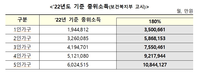 가구소득의 경우 신청자 본인을 포함한 가구원(배우자, 부모, 자녀, 미성년 형제·자매) 소득의 합이 지난해 기준 중위소득의 180% 이하여야 한다.