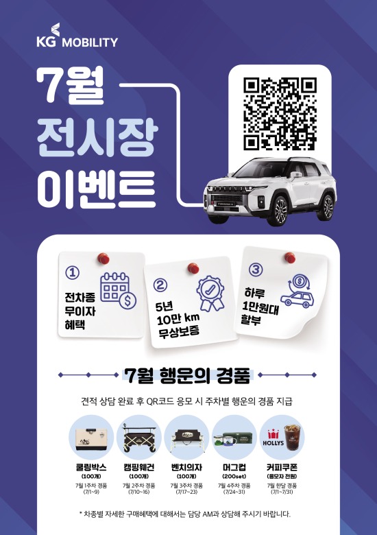 [2023년 7월 3일(월)] KG 모빌리티( www.kg-mobility.com )가 7월 한 달 동안 전시장 방문 이벤트 및 무이자 할부 등 고객 맞춤형의 다양한 판촉 프로모션을 시행한다고 3일 밝혔다.