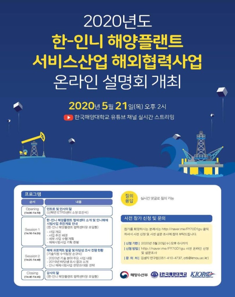 해양수산부(장관 문성혁)는 2020년 한-인니 해양플랜트 서비스산업 해외협력 사업을 홍보하고 사업 참여 기업을 모집하기 위해 한국해양대학교 유튜브를 통한 온라인 설명회를 21일(목) 진행한다.
