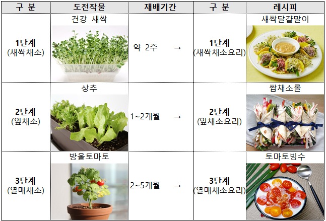 “도전! 꼬마 농부” 프로그램은 가정 연계 텃밭 재배(꼬마 농부의 하루) → 재배한 작물을 활용한 요리 실습(도전 제철 요리) → 꼬마농부 콘테스트의 총 3단계로 프로그램을 진행한다.