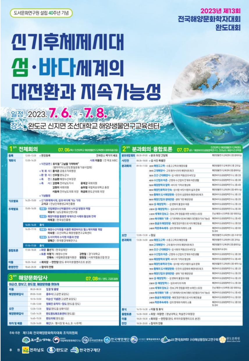 문화재청 국립해양문화재연구소는 목포대 도서문화연구원 등 해양문화유산 연구기관 연합과 오는 7월 6일(목)부터 8일(토)까지 조선대학교 해양생물연구교육센터(완도군 신지면)와 완도군 완도읍 및 고금면 일대에서 전국의 해양문화학자 250여 명이 참가하는 ‘제13회 전국해양문화학자대회’를 개최한다.