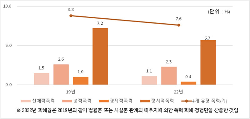 배우자·파트너에 의한 폭력 피해 경험 응답으로, 2021년 8월부터 2022년 7월까지 1년 동안 신체적·성적·경제적·정서적 폭력 중 하나라도 경험한 비율은 7.6%(여성 9.4%·남성 5.8%)로 2019년 조사 결과(전체 8.8%·여성 10.9%·남성 6.6%)보다 감소했다.