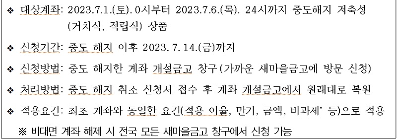 예금주는 가까운 새마을금고를 방문해 신청할 수 있다. 중도 해지 취소 신청서가 접수되면 계좌를 개설했던 금고에서 원래대로 복원해 준다.
