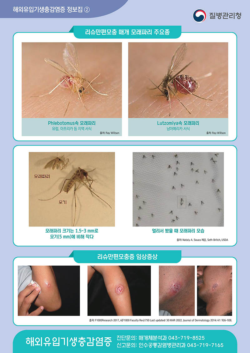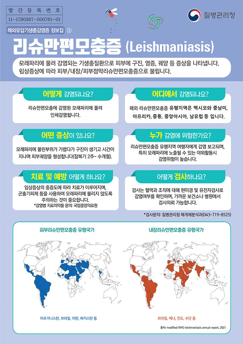 이에 따라 질병청은 중남미, 아프리카, 중동, 중앙 아시아 등 주요 위험지역을 여행 때 매개체인 모래파리에 물리지 않도록 각별한 주의가 필요하다고 강조했다.