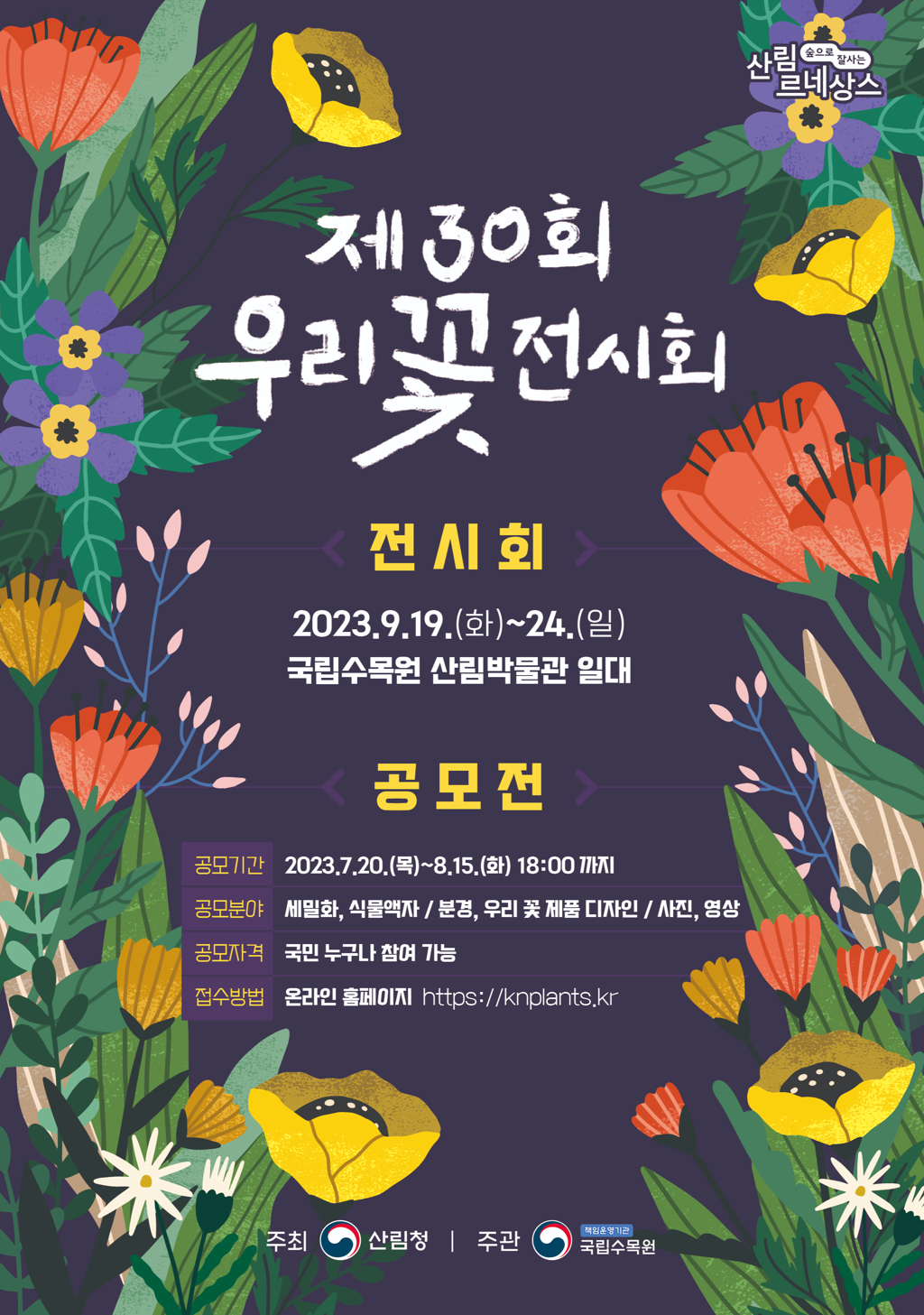 산림청이 주최하고 국립수목원이 주관하는 「제30회 우리 꽃 전시회」가 7월 20일부터 8월 15일까지(27일간) 공모전을 시작한다.