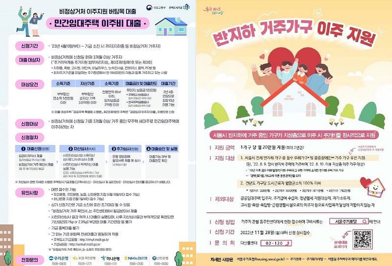 (사진 왼쪽부터)비정상 거처 이주지원 무이자 보증금 대출과 서울시 반지하 특정 바우처 안내문. (사진=국토교통부)
