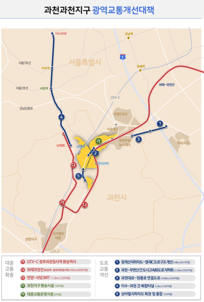 과천지구의 경우 선바위역ㆍ경마공원역(4호선) 등 기존 교통시설과 연계하여 서울․경기지역의 접근성을 보다 높일 수 있도록 철도ㆍBRT․환승센터 등 10개 사업이 포함된 광역교통개선대책을 수립하였다.