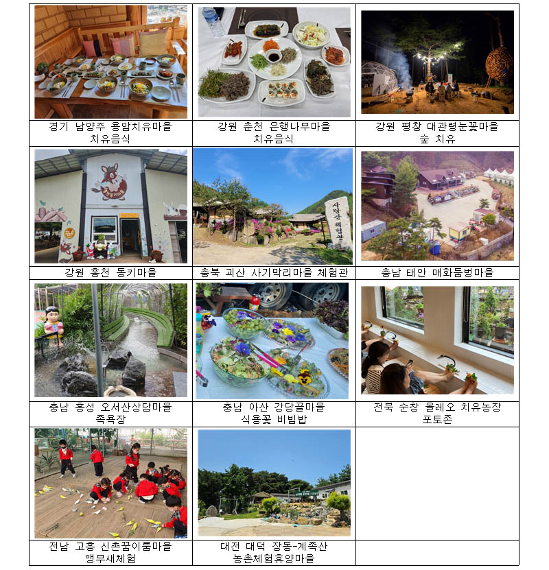 이번 우수 농촌치유마을 11곳은 2021년부터 2023년까지 선정된 전국 32곳 가운데 여름휴가에 알맞은 제반 시설을 갖추고 치유 서비스 연계가 잘 된 마을을 기준으로 선정됐다.