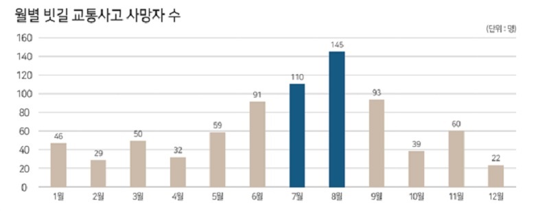 장마철 빗길 교통사고 치사율(교통사고 100건당 사망자수)은 2.01명으로 맑은 날(1.31명) 대비 1.5배 높아 빗길 사고 위험성이 높은 것으로 분석됐다.