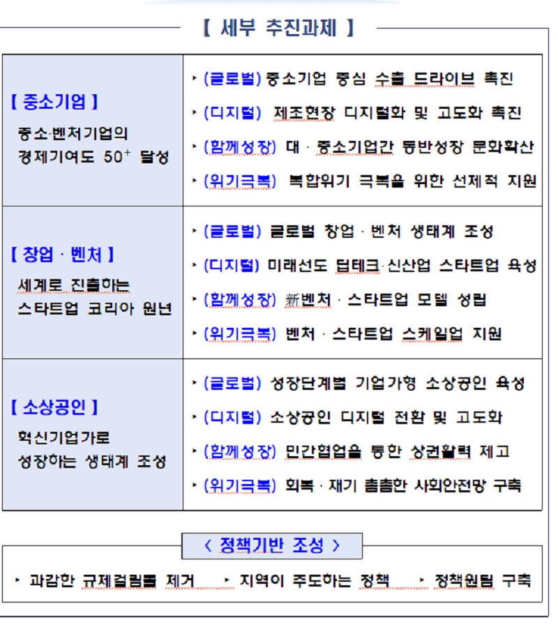 중소·벤처기업의 경제기여도 50+ 비전 달성에도 매진한다. 중소·벤처 50+ 비전은 중소기업이 대한민국 경제에서 기여하는 비중을 50% 이상으로 끌어올리겠다는 비전이다.
